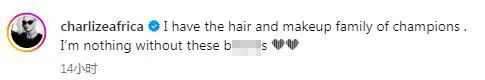当地时间12月9日,好莱坞知名女星查理兹·塞隆(CharlizeTheron)在个人社交媒体上发了几张漂漂亮亮的自拍照,配文“我拥有顶级的妆发团队。没有他们,我什么都不是”。